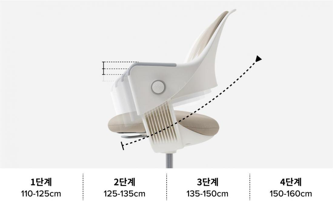 | 허리 밀착을 위한 4단계 조절 45° 각도 4단계 조절이 가능한 그로잉 기능으로 자라나는 아이의 체형에 맞게 상체를 등판에 밀착시켜 바른 자세 유지 및 집중력 향상에 도움을 줍니다. ※ 양쪽 손잡이를 잡아당기면 등판의 높이를 조절할 수 있습니다. | 높이 조절로 무릎 각도 90도 유지 레버를 이용하여 간편하게 의자의 높낮이 조절이 가능합니다. |