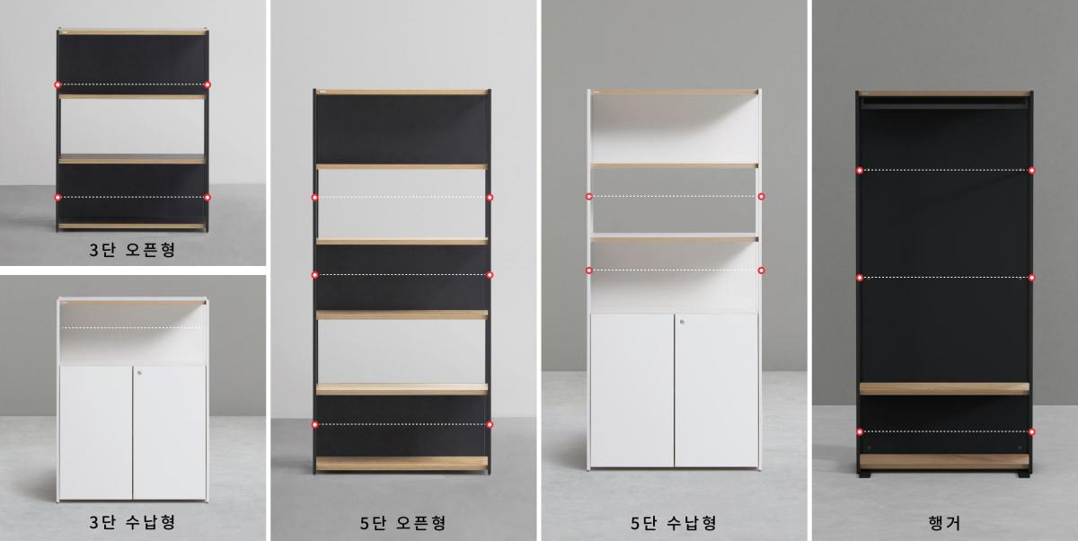 철제책장 프레임 1,3,4단에 설치되며(수납형의 경우 1단에 설치 홀 없음), 행거 프레임의 경우 5단 철제책장의 커넥팅 홀과 동일 위치에 설치됩니다.