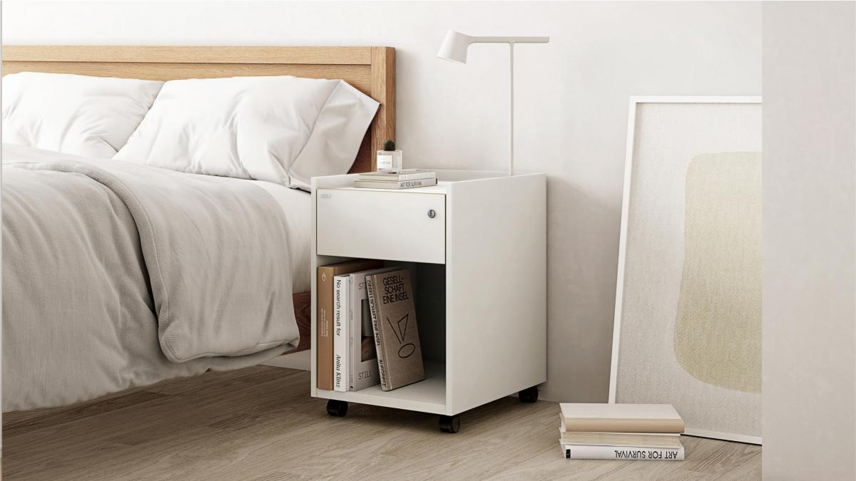 침대 옆에 배치하여 협탁처럼 사용해보세요. 서랍 위에 테이블 조명이나 핸드폰 충전기 등 자기 전 자주 사용하는 물건을 두고,